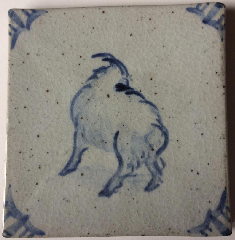 Toen zeide Boaz tot zijn knecht, die over die over de maaiers gesteld was: Bij wien behoort deze jonge vrouw? De voorstelling op de tegel doelt echter op Ruth 2; vers 8. Hierop zeide Boaz tot Ruth: Hoor eens, mijn dochter, ga niet oplezen in een ander veld en ga ook niet hier vandaan; sluit u dan aan bij mijn arbeitsters, - gij ziet daar het veld voor u. Je zou het een maandagochtendtegel kunnen noemen. De tegel is compleet maar wel gelijmd en dateert uit de late 18e eeuw. Afmetingen: 13,25 x 13 x 0,7 cm € 5, maart 2009, www.muntenbodemvondsten.nl/ opgravertje