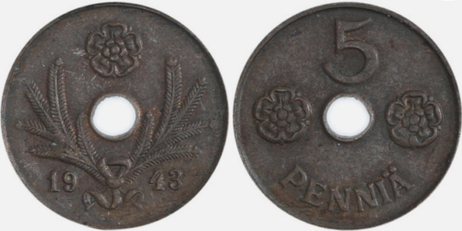 | Land | Finland | Omschrift keerzijde | 5 PENNIÄ |