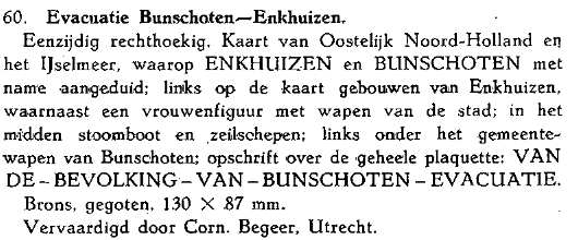 Algemeen Handelsblad, 3 mei 1941 "Vrijdag zal een bronzen gedenkplaat door de ingezetenen van Bunschoten als herinnering aan de genoten gastvrijheid tijdens de Mei-dagen van 1940 aan het gemeentebestuur van Enkhuizen worden aangeboden. De gedenkplaat geeft een voorstelling van een gedeelte van het IJsselmeer met de Noord Hollandsche kust en de stad Enkhuizen aan de linkerzijde, terwijl in den benedenhoek de dorpen Spakenburg en Bunschoten zichtbaar zijn. De woorden, die in de gedenkplaat zijn gegraveerd, herinneren aan de evacuatie. De plaat zal worden aangebracht in het raadhuis te Enkhuizen. De reis naar Enkhuizen zal per boot geschieden. Verwacht wordt, dat tal van visschersvaartuigen de boot, waarop zich de officieele deputatie bevindt, zal vergezellen"