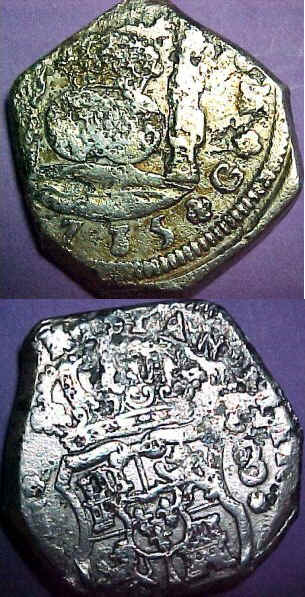 DATED 8 REALE GUATAMALA "HOLLANDIA'' 1735 THIS BEAUTIFUL SILVER 8 REALE PILLARS COIN WAS SALVAGED FROM THE SHIPWRECK "HOLLANDIA" THAT SANK ON THE NIGHT OF 7-13-1743 OFF THE ISLES OF SCILLY, ENGLAND AFTER STRIKING THE INFAMOUS "Gunner Rock" WITH THE LOSS OF 276 LIVES. IT WAS ENROUTE FROM TEXEL IN THE NETHERLANDS BOUND FOR BATAVIA (NOW JAKARTA INDONESIA). IT WAS DISCOVERED IN SEPT OF 71 BY REX COWAN WHO PROCEEDED TO SALVAGE THE WRECK THE NEXT YEAR. THIS COIN HAS A BEAUTIFUL DATE OF (1)735 AND WAS MINTED IN GUATEMALA (G) BY ASSAYER J (Jose de Leon y Loza) who was the only assayer in Guatemala, UNDER THE REIGN OF PHILIP V. IT COMES WITH A CERTIFICATE OF AUTHENTICITY SIGNED BY THE NOTED AUTHOR AND SHIPWRECK COIN EXPERTS DANIEL AND FRANK SEDWICK as well as a flip card in his handwriting. US $106.50 (euro 84,74), Feb-04-05 ebay, bayboy2003 |