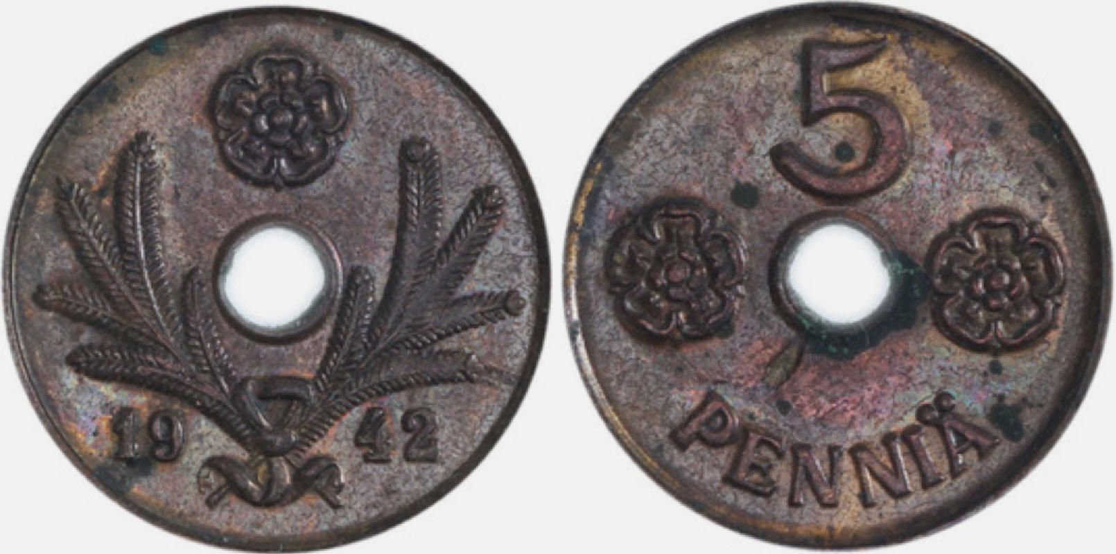 | Type munt | 5 Pennia | Omschrift voorzijde | 19 42 | Muntconditie | prachtig |