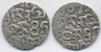 clear obverse. That's why i'm putting them in the same lot. Obverse - Bhadrapitha symbol. Note that the centre of the symbol takes the form of a four-petaled rosette, whereas in the Class C and D series the centre is a solid circular disc. Reverse - Simple form of a srivatsa (Temple of the fertility goddess, Sri) with an obelisk or phallus in the centre, flanked by eight small angular bead-like objects. On the left is a vajra (thunderbolt) and a wavy conch to the right. Above the srivatsa is a sun with rays and a moon. The moon is no longer visible due to holes made at the top, at a later date, that suggests the coins have been as part of a necklace. Below the srivatsa are two wavy lines, representations of water. Weight : 7g each GBP 10,00 (EUR 14,71), 21-sep-05 , ebay, shwenaga |