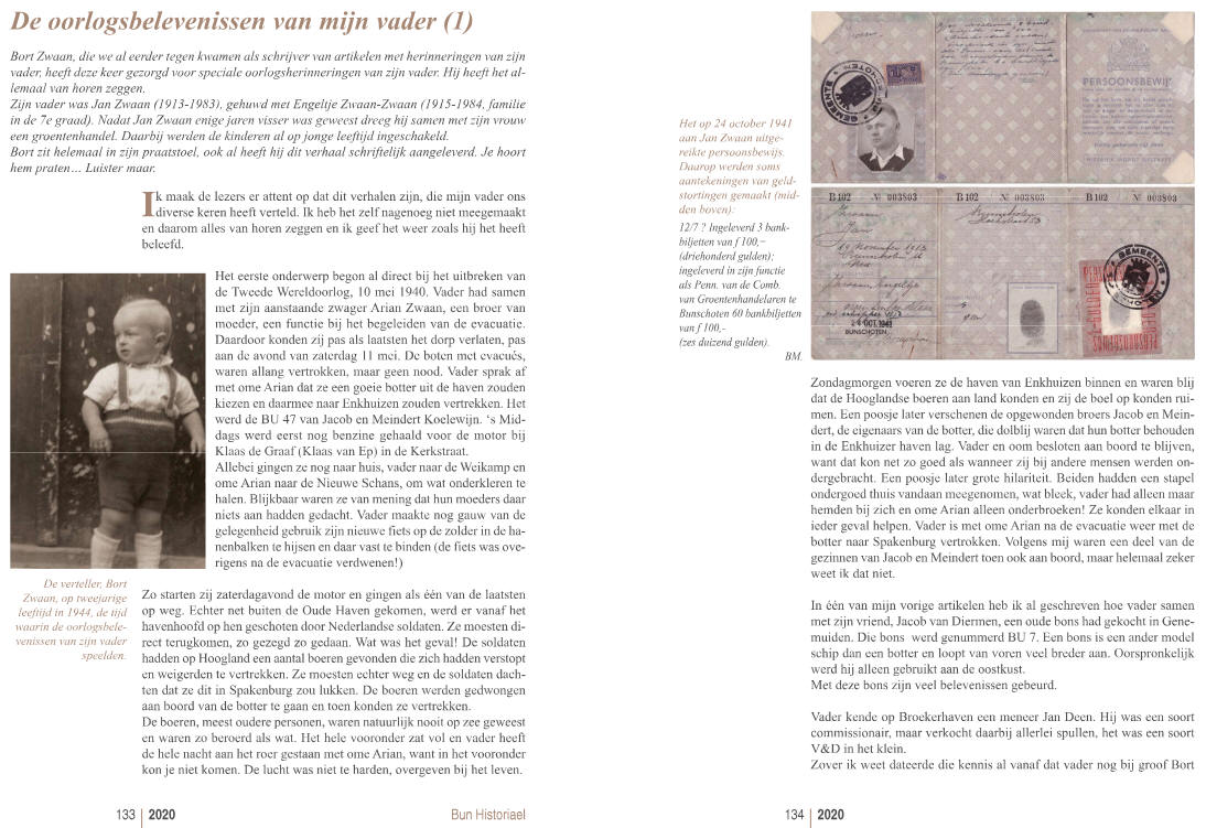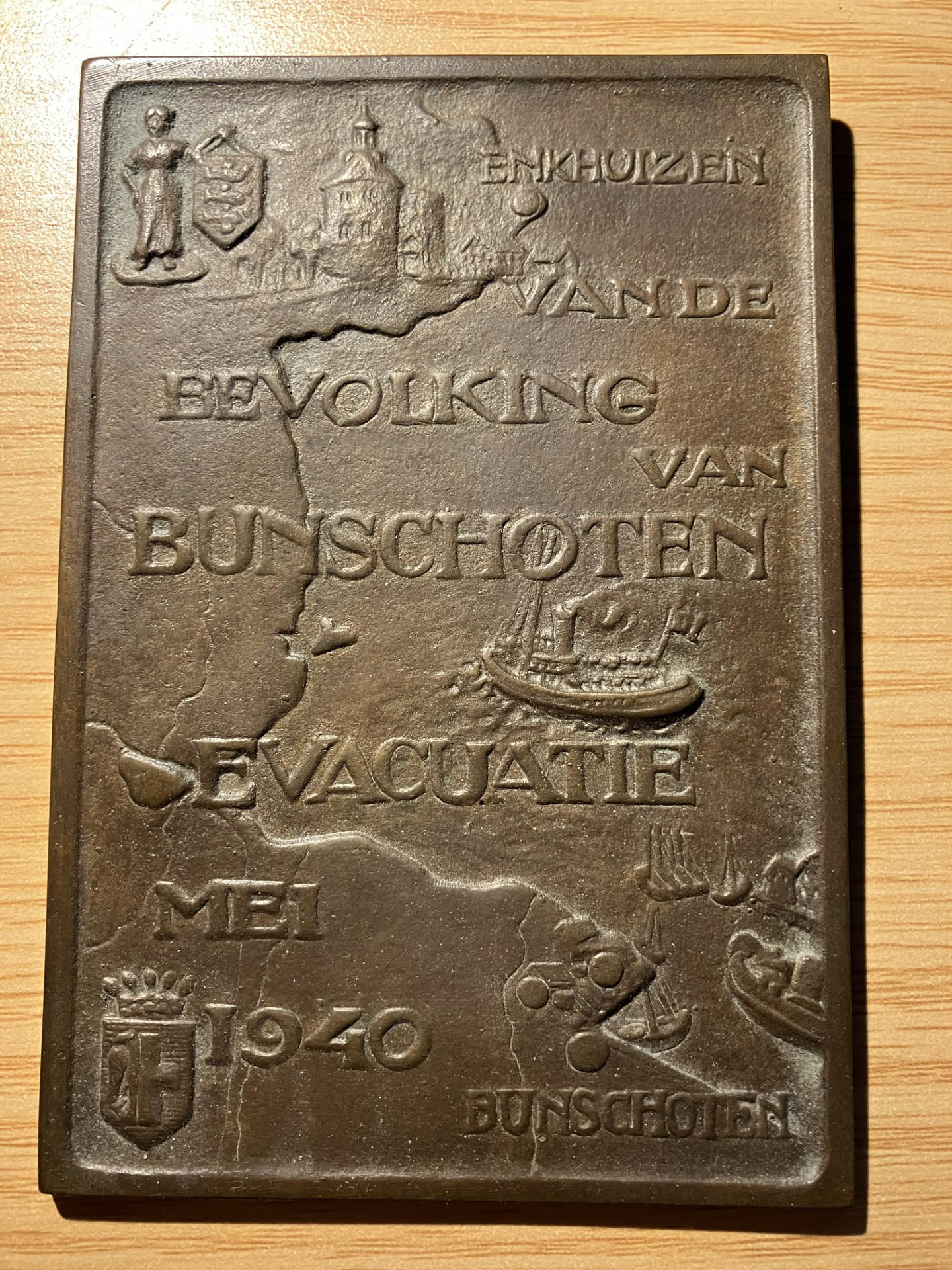 Algemeen Handelsblad, 3 mei 1941 "Vrijdag zal een bronzen gedenkplaat door de ingezetenen van Bunschoten als herinnering aan de genoten gastvrijheid tijdens de Mei-dagen van 1940 aan het gemeentebestuur van Enkhuizen worden aangeboden. De gedenkplaat geeft een voorstelling van een gedeelte van het IJsselmeer met de Noord Hollandsche kust en de stad Enkhuizen aan de linkerzijde, terwijl in den benedenhoek de dorpen Spakenburg en Bunschoten zichtbaar zijn. De woorden, die in de gedenkplaat zijn gegraveerd, herinneren aan de evacuatie. De plaat zal worden aangebracht in het raadhuis te Enkhuizen. De reis naar Enkhuizen zal per boot geschieden. Verwacht wordt, dat tal van visschersvaartuigen de boot, waarop zich de officieele deputatie bevindt, zal vergezellen"