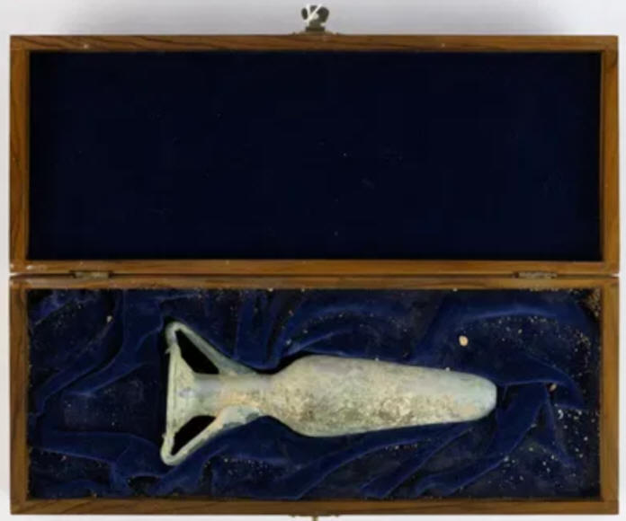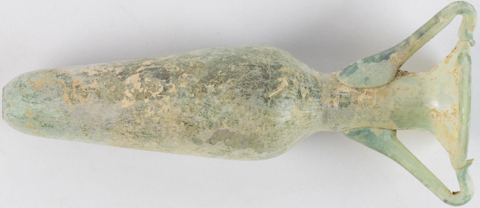 A Roman amphora shaped unguentaria with lovely iridescence and encrustation, intact in fitted olive wood box, with card of Bart Wille, Knokke-Zoute, Belgium. From the collection of Joseph Luns (1911-2002)