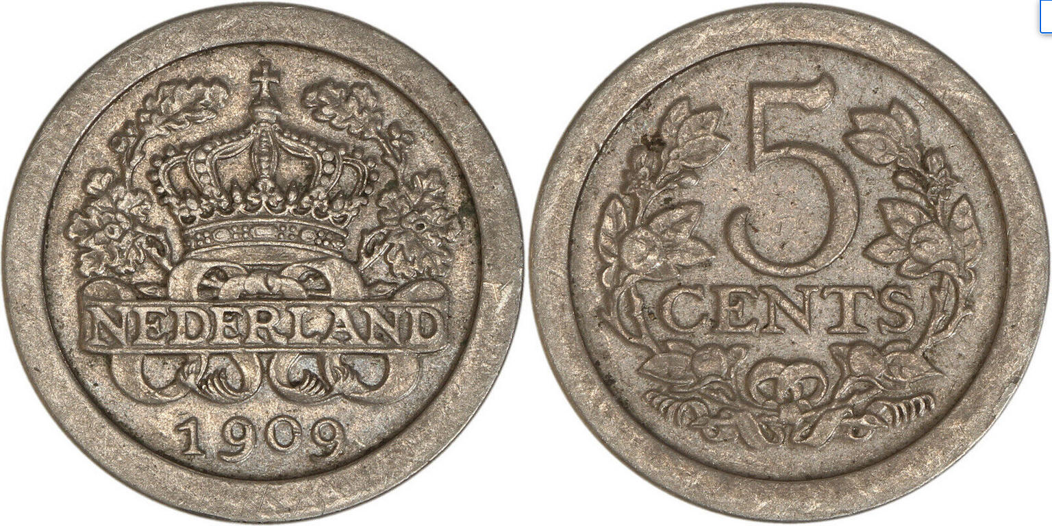 ![]() country: Netherlands denomination: 5 Cents material: copper-nickel date: 1909 variety: (key date!) grade: almost uncirculated weight: 4,407 grams, 18,06 18,07 ebay, US $25,47 (EUR 23,50), 23 nov. 2022, koevoets_numismatics |